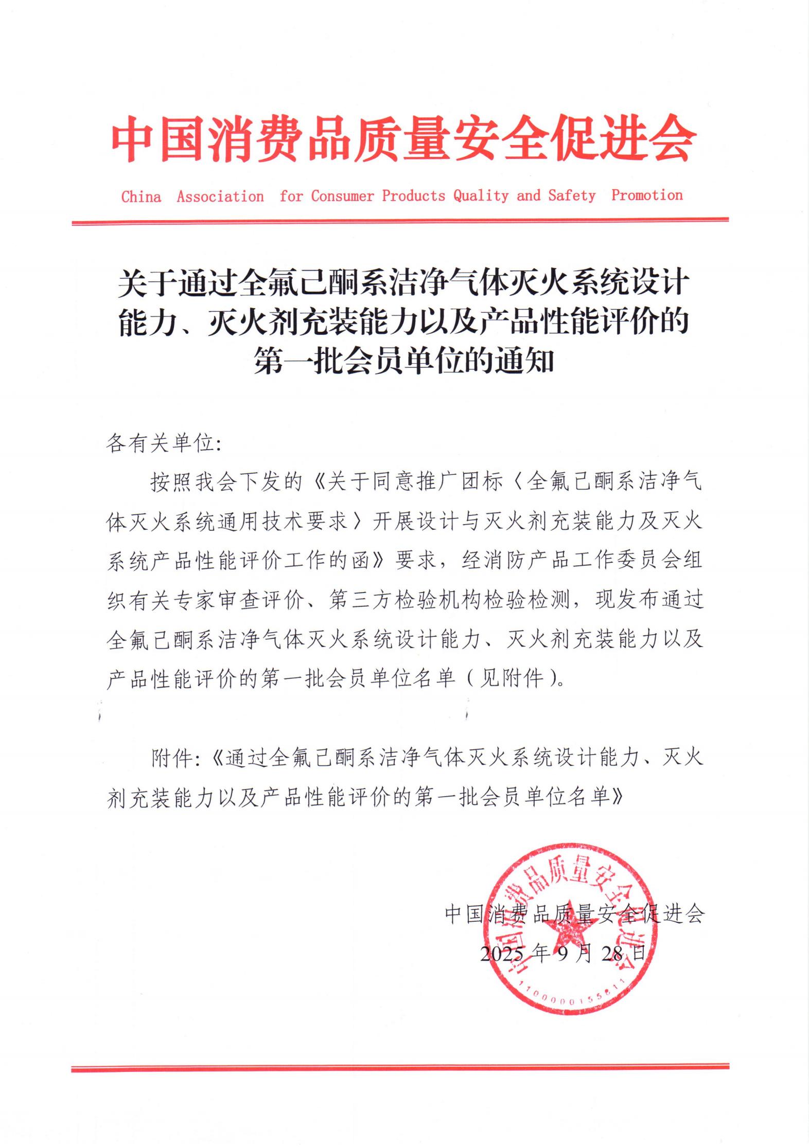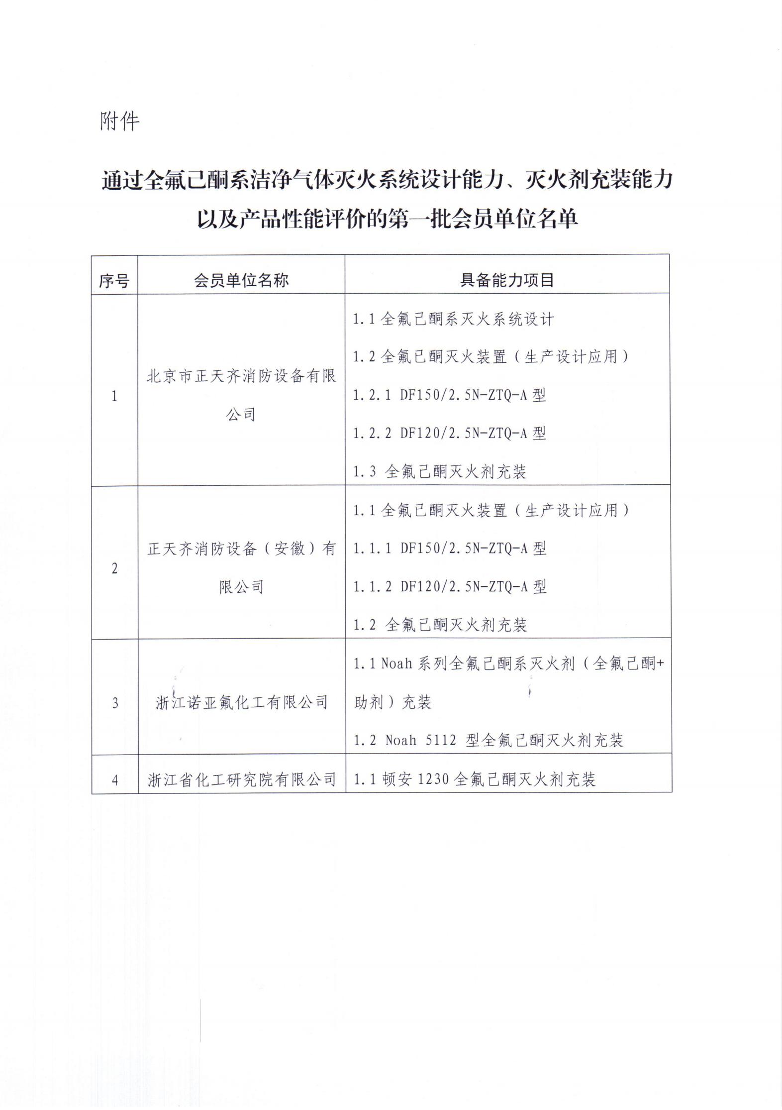 关于通过全氟已酮系洁净气体灭火系统设计能力、灭火剂充装能力以及产品性能评价的第一批会员单位的通知